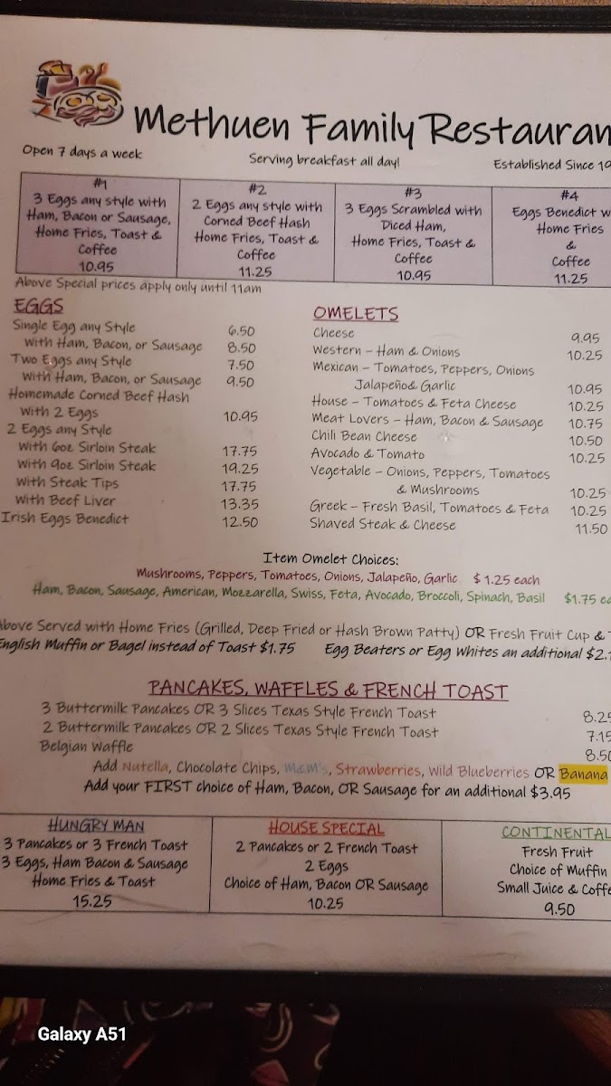 Welcome to Methuen Family Restaurant, where comfort food meets homey vibes at 246 Broadway, Methuen, MA. This cozy eatery is your go-to destination for hearty breakfasts and delightful sandwiches. The menu boasts an array of options, from classic dishes like 2 Eggs Any Style with home fries and toast for just $7.75, to the indulgent Homemade Corned Beef Hash at $11.25. If you're in the mood for lunch, their Turkey Club ($13.25) and Tuna Melt ($8.75) shine with generous portions that keep customers returning for more.